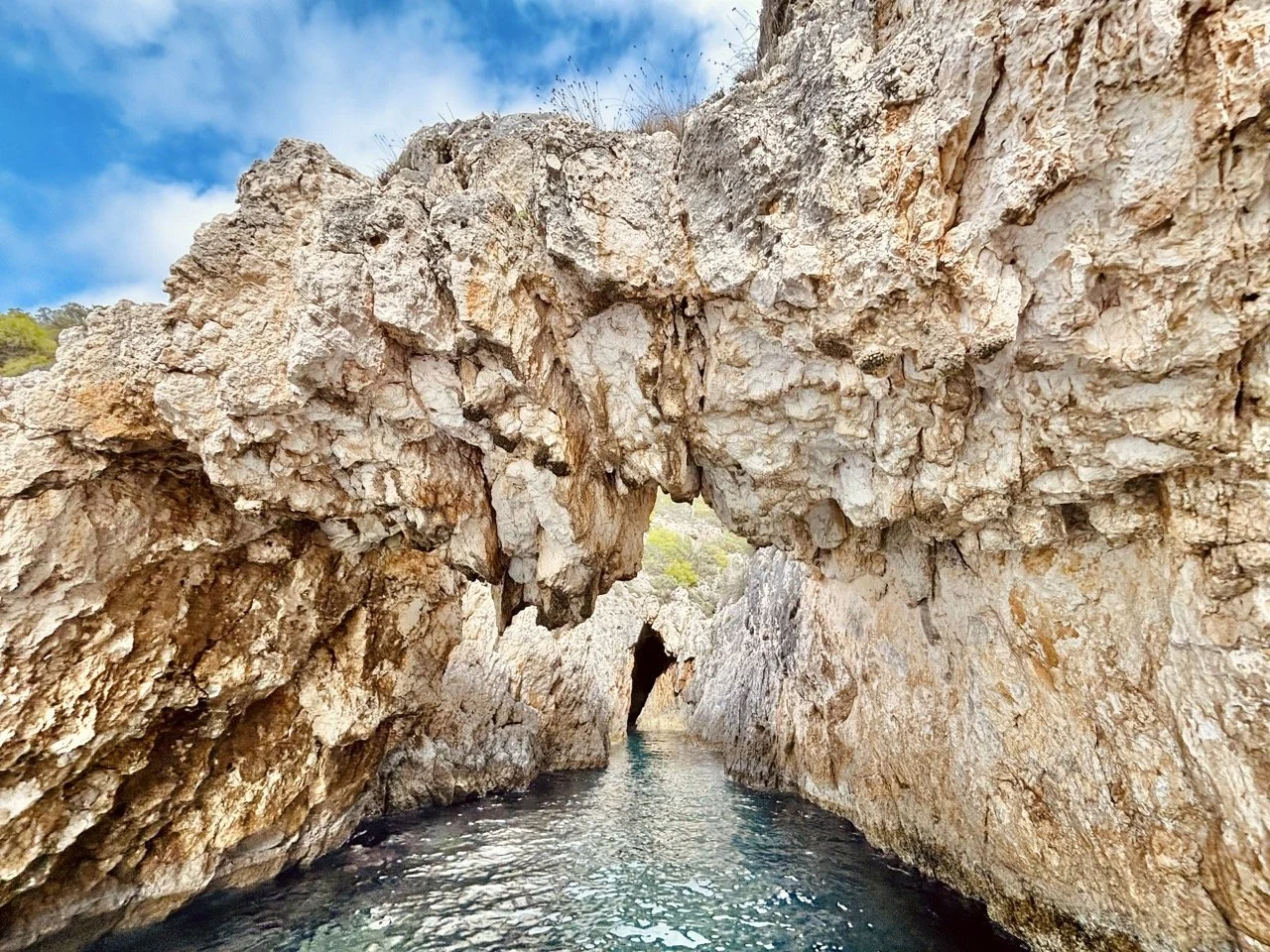Blue Caves: early sunlight beams through arches.
